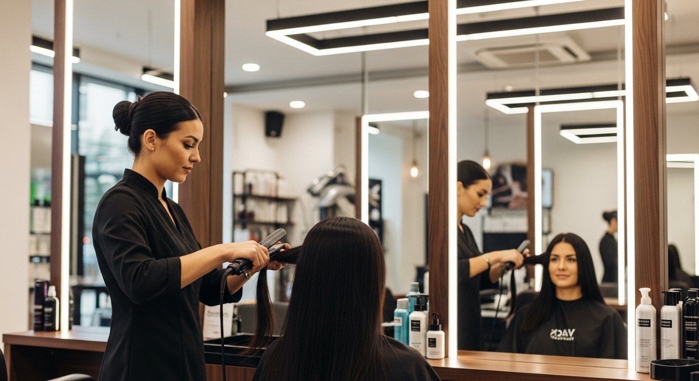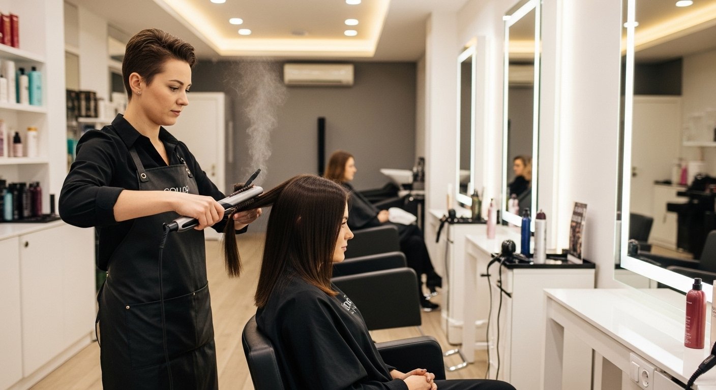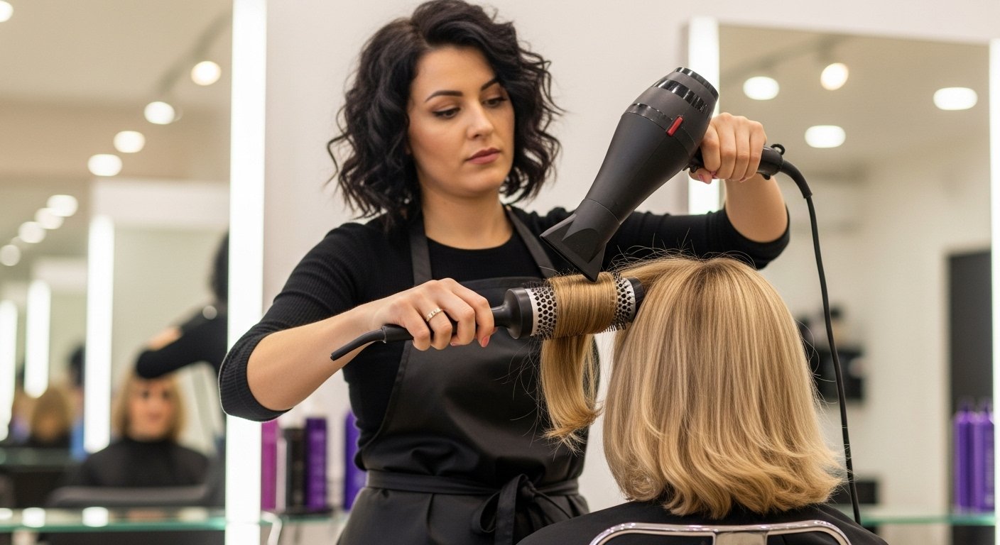 Frisörelev som utför behandlingar under handledning med fokus på noggrannhet och kundkomfort.
